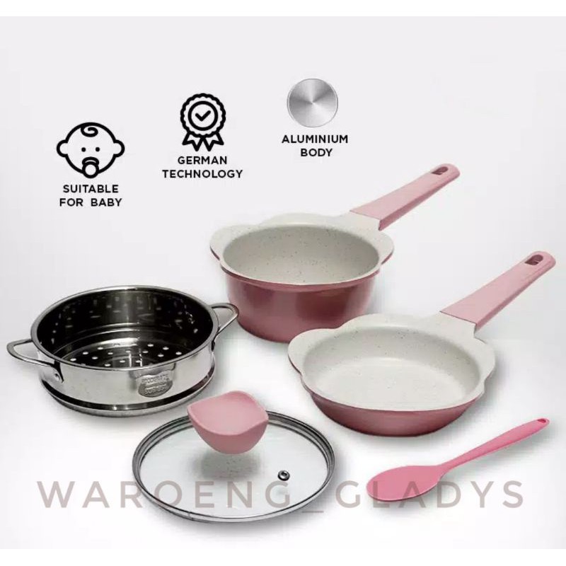 SET COOKING FOR MPASISet cooking yang sangat cocok sekali digunakan untuk bayi dan anak anak. Di design khusus untuk keluarga baru yang baru saja mempunyai anak. Panci ini sangat aman digunakan oleh ibu-ibu untuk merebus botol susu bayi, memasak bubur, dan segala keperluan dan masakan untuk bayi. Makanan pun bisa dihangatkan dengan steamer yang sudah disediakan.Orang tua manapun pasti ingin yang terbaik untuk anaknya, terutama kesehatan dan apa yang dikonsumsi anaknya untuk pertembuhan anak. Orang tua pasti tidak ingin memasak menggunakan panci bekas yang mungkin sudah terdapat berbagai macam bakteri yang dapat membuat anak bayi mudah kena penyakit. Panci bekas yang dimaksud adalah panci bekas menggoreng makanan berminyak dan lain sebagainyaSet cooking ini terbuat dari aluminium BodyWith Steamer Concept dengan MBH non stick teknologi jerman dan terdiri dari 1 Frypan dengan ukuran 16cm. 1 panci susu ukuran 16cm dan steamer cantic yang terbuat dari stainless steel untuk keperluan mengkukus serta tutup kaca untuk panci susu.Coating panci ini sangat aman digunakan oleh ibu untuk memasak MPASI yaaaaa