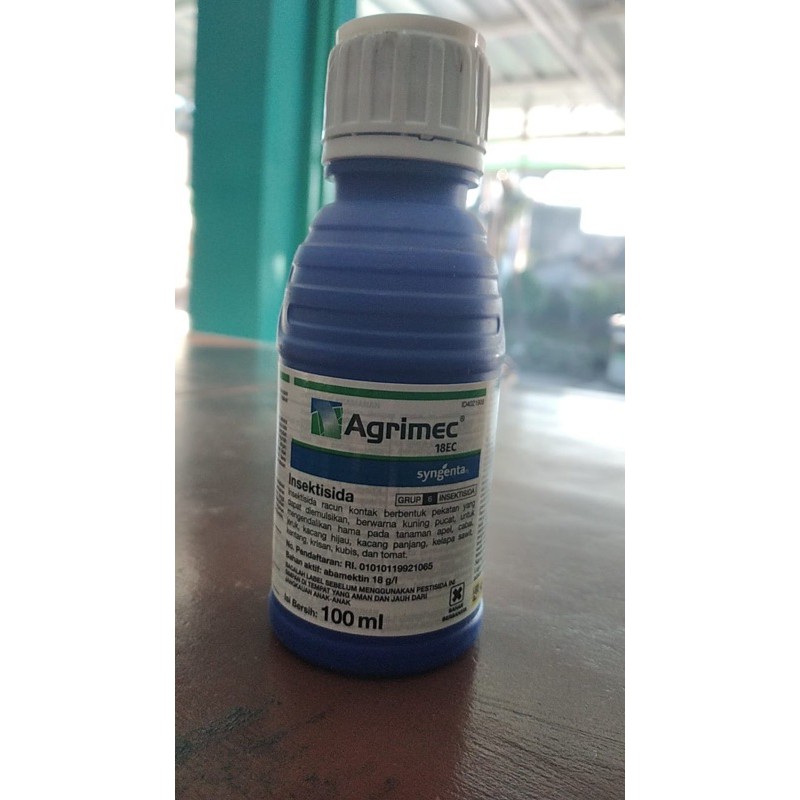 Agrimec 18 Ec Kemasan 100 MLBahan Aktif : Abamektin 18 g/lPabrik : PT Syngenta IndonesiaKemasan : 50mlRacun kontak & perut yg jg bersifat AKARISIDAAmpuh mengendalikan Thrips, Tungau, Ulat Daun cabai, jeruk, kcg panjang, kcg hijau, tomat, kubis dll. Dgn dosis yg rendah, ttp memiliki daya berantas tinggi & konsisten terhadap hama sasaran Aplikasi & dosis pakai :Apel : kutu daun Aphis pomi (penyemprotan vol tinggi : 0,25-0,5 ml/l)Cabai : hama thrips Thrips parvispinus (penyemprotan vol tinggi : 0,25-0,5 ml/l)Jeruk : penggerek daun Phyllocnistis citrella (penyemprotan vol tinggi : 0,25-0,5 ml/l)Kacang hijau : ulat grayak Spodoptera litura, perusak daun Phaedonia inclusa, penggulung daunLamprosema indicata, penggerek polong Etiella zinckenella, pengisap polong Riptortus linearis (Penyemprotan vol tinggi : 0,5-1 ml/l)Kacang panjang : penggerek polong Maruca testulalis (Penyemprotan vol tinggi : 0,5-1 ml/l)Kentang: pengorok daun Liriomyza huidobrensis, hama thrips Thrips palmi (Penyemprotan vol tinggi : 0,25-0,5 ml/l)Kubis : perusak daun Plutella xylostella, ulat krop Crocidolomia pavonana (penyemprotan vol tinggi : 0,5-1 ml/l)Tomat : pengorok daun Liriomyza huidobrensis (Penyemprotan vol tinggi : 0,5-1