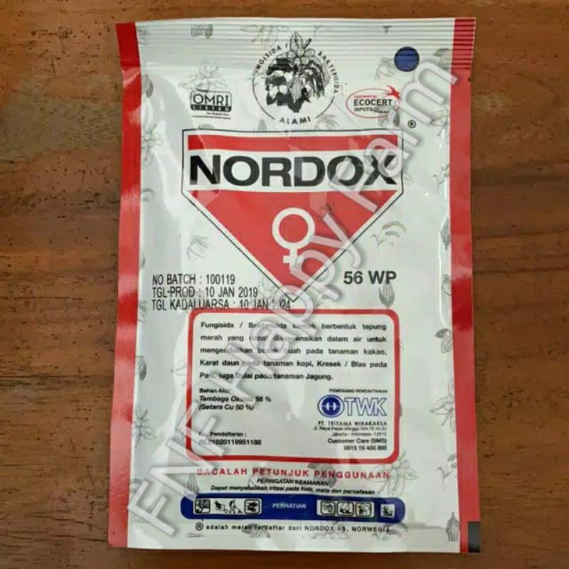 NORDOX 56WP 100grFUNGISIDA/BAKTERISIDABahan aktif : tembaga oksida 56 (setara Cu 50%)Fungisida/bakterisida kontak berbentuk tepung merah yang dapat disuspensikan dalam air untuk mengendalikan penyakit pada tanaman kentang, teh, kakao, kopi, padi, dan jagungPETUNJUK PENGGUNAANKENTANGPenyakit : busuk daunDosis : 2 g/l air ( 1 sendok makan / tangki 15 l )Cara : penyemprotan volume tinggi dimulai pada umur tanaman 30 hari dan diulang 1 minggu sekali.TEHPenyakit : cacar daunDosis : 75 200 g/haCara : penyemprotan volume tinggi pada permukaan daun tanaman dimulai 1 hari setelah pemetikan dengan interval 3 7 hari sekaliKAKAOPenyakit : busuk buahDosis : 3 4 gr/l (1,5 2 sendok makan/tangki air 15 liter)Cara : penyemprotan langsung ke buah, batang dan cabang tanaman dimulai pada waktu musim hujan tiba dan diulang 2 minggu sekali sebanyak 5 7 kali aplikasiKOPIPenyakit : karat daunDosis : 2 6 g/l air 0,5 1 sachet 100 gr/tangki 15 lCara : penyemprotan volume tinggi pada daun tanaman waktu serangan penyakit datang dan diulang 2 4 minggu sekali, tergantung hujanDan cocok digunakan pada tanaman padi sawah, pado gogo, dan jagungNetto :