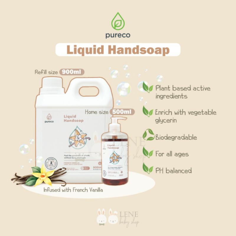 Pureco Liquid Handsoap. Exp Date: 03/2023✅Infused with French Vanilla.✅pH Balanced✅Biodegradable✅Enrich with Vegetable Glycerin✅Plant based active ingredients✅For all agesAvailable in 2 sizes: Home size 500ml and refill size