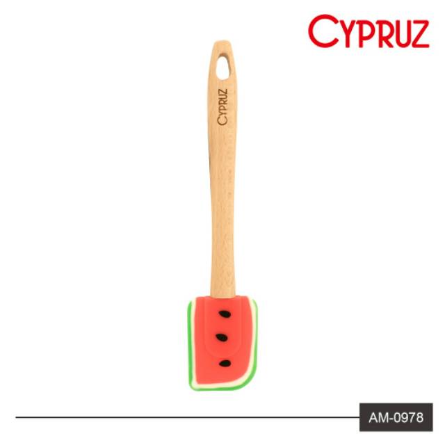 Sodet semangkaSpatula lengkung bahan siliconeGagang KayuTahan panas hingga 270cUkuran 31.5cm x 6 cmPanjang 31