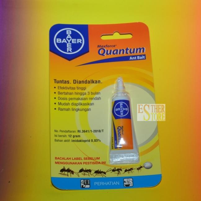 Ready stock kak,,,silahkan order !!!! keburu habisss...READY YANG KEMASAN BARU-----Maxforce Quantum merupakan insektisida berbentuk liquid gel bening untuk mengendalikan semut di restoran, kafe, food court, food processor, pantry, dan tempat penyimpanan makanan. Maxforce Quantum mengendalikan semua jenis semut yang sering menjadi pengganggu di pemukiman dan area komersial baik semut yang menyukai makanan mengandung gula atau berprotein. Kehebatan Maxforce Quantum :1. Mengendalikan semua jenis semut yang sering menjadi pengganggu. 2. Mengendalikan koloni semut dalam waktu yang cepat setelah aplikasi.3. Tidak perlu alat tambahan dan dapat langsung digunakan.4. Kemasan praktis dan ekonomis.5. Resiko keracunan aplikator dan orang-orang di sekitar sangat minimal.Cara Aplikasi: Buka tutup tabung, selanjutnya tekan pada ujung lainnya secara perlahan hingga isinya keluar. Aplikasikan secara horisontal sebanyak 0,1 g/m2 di dekat sarang atau jalannya semut. Koloni semut akan mati mulai 3 hari setelah aplikasi.Berat bersih 12 gramFormulator : PT Bayer IndonesiaNomor Pendaftaran : RI.3641/1-2010/TBahan Aktif : Imidakloprid