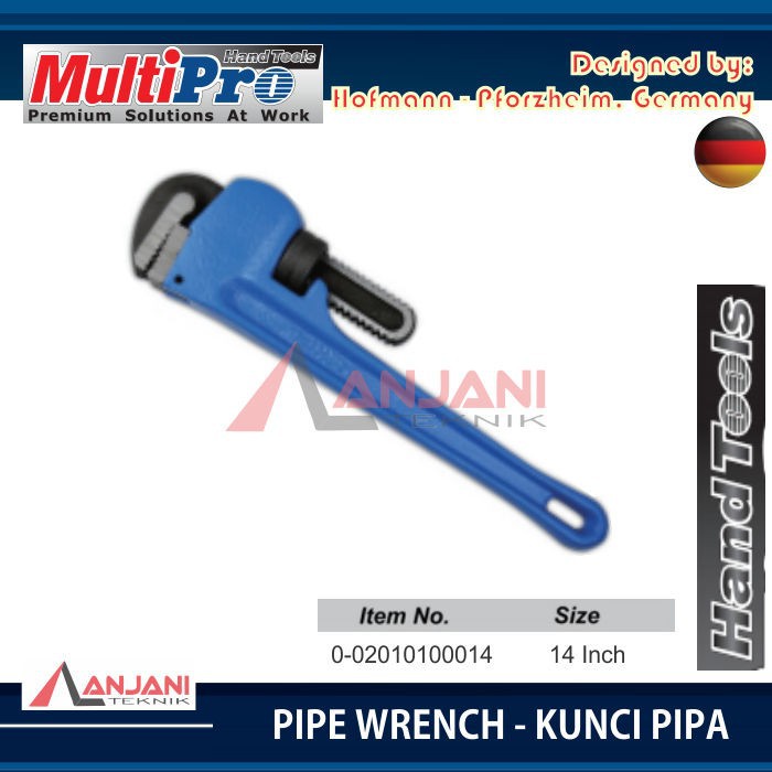 MULTIPRO HAND TOOLS(HEAVY DUTY) KUNCI PIPA 14" / PIPE WRENCH 14"Desain oleh : Hofmann - Pforzheim, GermanySPESIFIKASI :Item No. 0-02010100008Size : 14 Inch / 350mm- Germany Type- Precision milled teeths- Precision Casted Handle- Conform To GS Sta