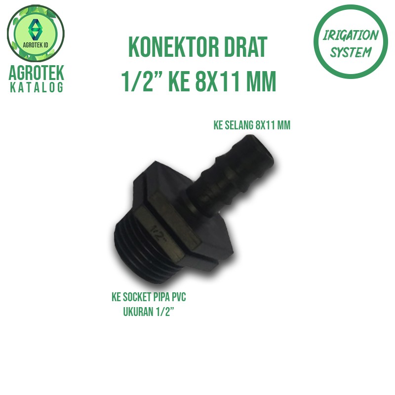 Connector Straight Reducer, Konektor Lurus, 1/2" to 8 mm x 11 mm:- Digunakan untuk menyambung selang PE/PVC dalam sistem irigasi.- Ukuran drat luar 1/2" (socket pipa PVC).- Ukuran selang PE/PVC 8 mm x 11 mm atau 9 mm x 12 mm (diameter dalam x diameter dalam) atau