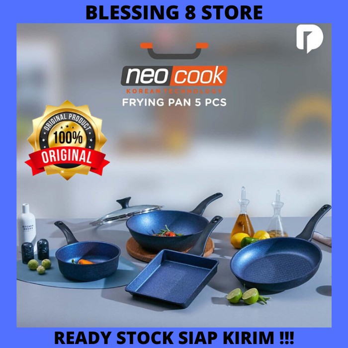 READY STOCK YANEWSIAP KIRIM SEGERA DI ORDERNeocook Frying Pan set of 5Neocook adalah set panci yang dapat digunakan sehari-hari dengan isi yang lengkap dan multifungsi.1 set terdiri dari:- Fry Pan, Diameter 28 cm- Wok Pan, Diameter 28 cm- Tutup Kaca 28 cm- Multi Fungsi Pan, Diameter 20 cm- Square Pan 23 cmKenapa harus Neocook Frying pan set of 5?- Fungsional dengan Design Eropa yang mewah- Dicetak dengan teknologi premium die-casting, dengan Teknologi Korea- Ukuran wajan yang pas untuk memasak hidangan keluarga- Dengan 11 Lapisan Anti Lengket Megastone Coating : Pelapisan Megastone adalah bahan pelapis anti lengket yang dicampur dengan bahan Zirkonium & Keramik seperti biotit agar lebih tahan lama terhadap goresan dan lecet.- Coating lebih kuat dan tahan lama, cocok untuk masakan Indonesia yang mengandung banyak bumbu rempah, asam dan gula- Tahan Gores dengan motif 3D cantik di permukaan wajan- Mudah dibersihkan- Pegangan Bakelite, yang tidak mudah panas- Matang merata dengan sedikit atau tanpa minyak- Bersertifikat Non PFOA dan