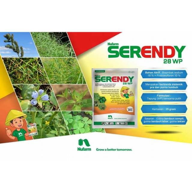 SUDAH HADIR SERENDY 28 WP, GULMA TUNTAS DENGAN SATU SOLUSI.Herbisida sistemik pra dan purna tumbuh berbahan aktif : bispiribak sodium 18 % + pirazosulfuron 10 % berbentuk tepung yg larut dalam air, berwarna putih, untuk mengendalikan gulma daun lebar, gulma daun sempit dan teki pada pertamanan padiTerus maju bersama 1 bungkus bisa untuk 3 t