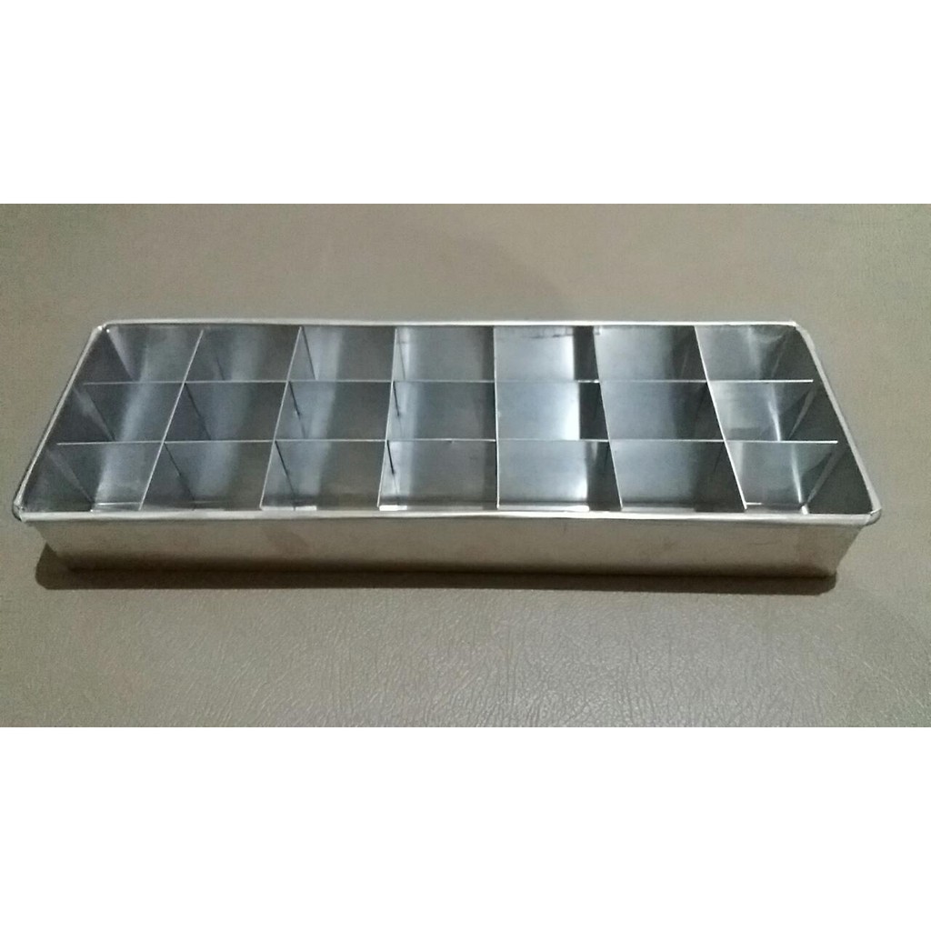 Loyang sekat brownies / bolu ukuran 30 X 10 X 4 cmbahan loyang nya 0.5 mmberbahan Aluminiumjumlah sekat 21 lubangCocok Untuk tempat cetakan Kue Brwonies Mini atau Bolu mini, untuk acara keluarga dan la