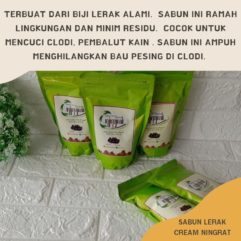 DESKRIPSI WAJIB DIBACA YA MOM Ningrat Sabun Lerak Cair dan Cream yang terbuat dari bahan alami yaitu buah lerak yang ramah lingkungan sehingga aman untuk kulit.⭐ Ningrat Sabun Lerak Cair dan Cream dapat digunakan untuk mencuci Clodi, Menstrual pad, Breastpad, Kain Batik, Pakaian bayi dan lain-lainNingrat Sabun Lerak Cair dan Cream tidak mengandung pemutih, pewangi, pelembut & enzim -> tidak meninggalkan residu pada serat kain. Sehingga daya serap insert clodi maupun menspad menjadi maksimal.Oleh karena itu Bunda tidak perlu khawatir lagi untuk mempercayakan pencucian clodi, pakaian bayi, menspad dan pakain lainnya menggunakan deterjen Ningrat Sabun Lerak Cair dan Cream ini.Ningrat Sabun Lerak Cair dan Cream kemasan 300 gram untuk cream dan 300ml untuk cair dapat digunakan untuk mencuci cloth diaper selama 1b