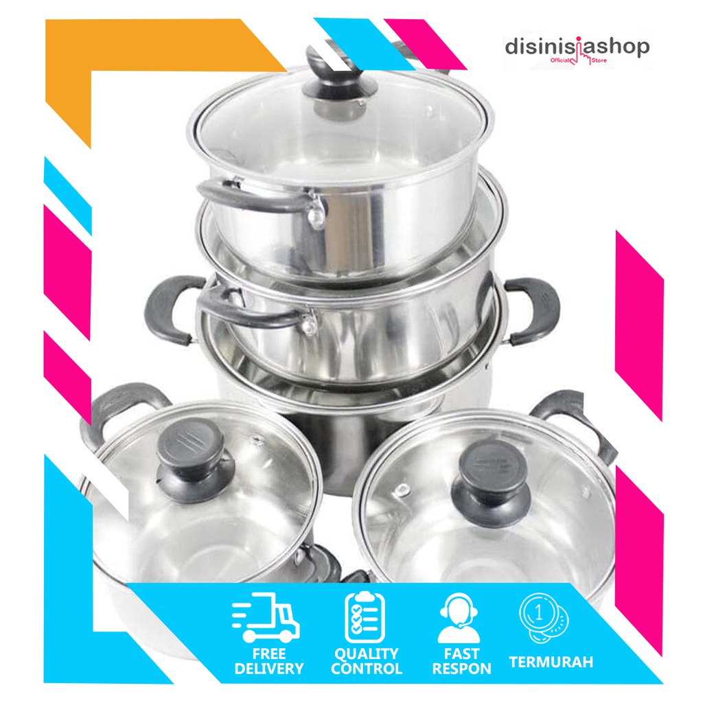 Distributor Perlengkapan di Kabupaten Sumbawa Barat [disiniaja] [panci 5 Susun] Panci Beranak Stainless Steel Tutup Kaca Set Isi 5pcs dari Tidak Ada Merek Kota Jakarta Barat