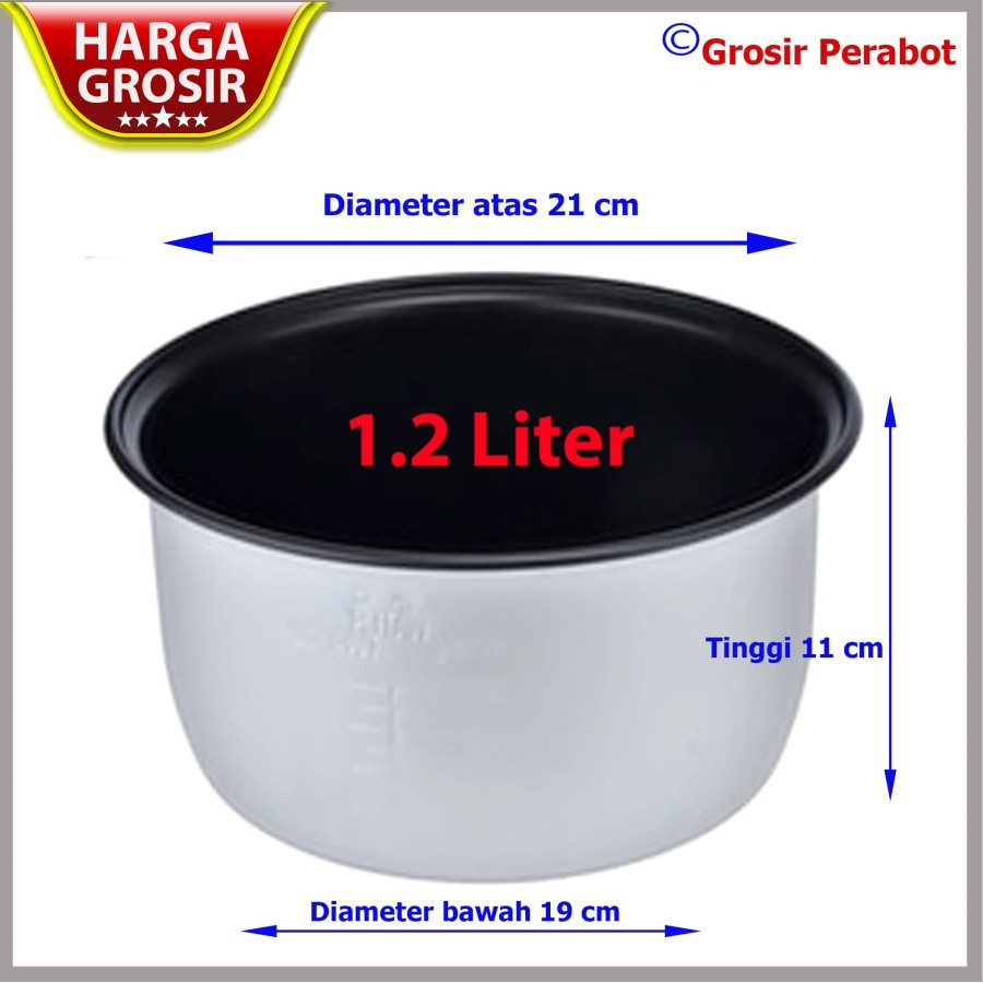 Panci Teflon Magic Com Rice Cooker Miyako 1.2 Liter - MCM-612 - 100% ORIPanci dijamin asli Miyakjo100 %.Ada logo Miyako di dalam panci.Dimensi :Diameter atas = 21 cmDiameter bawah = 19 cmTinggi = 11 cmNote:Bisa dipakai untuk merk lain selain Miyako, asalkan dimensinya sama atau hampir samaMiyako Panci Teflon Rice Cooker - 1.2 Liter disediakan oleh Miyako untuk menggantikan panci Anda yang lengket.Kini Anda tidak harus membuang nasi yang lengket pada panci ataupun berkerak dikarenakan panci yang sudah rusak.Panci ini cocok untuk Miyako Magic Warmer (rice cooker 3in1) ukuran 1.2 liter seperti MCM-