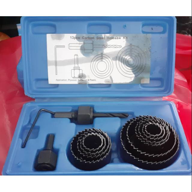 Holesaw Hole Saw Set Benz 13pcs 13 Pcs Mata Bor Lubang Kayu Pipa Hodroponik HOLE SAW SET 13PCS BenzKegunaanUntuk melubangi lubang pada bahan plastik (PVC), kayu (jenis softwood, triplek)Bahan mata bor adalah HSS 10 Ukuran mata bor yang tersedia:- 19mm- 22mm- 25mm- 28mm- 32mm- 35mm- 38mm- 44mm- 54mm- 64mmContoh penggunaan pada sehari hari- melubangi triplek belakang papan tv cabinet untuk memasukan kabel AV dvd- melubangi penutup wadah container untuk memasukan net pot (Hidroponik user)Bisa di pasang pada mesin bor tangan ukuran 10mm dan