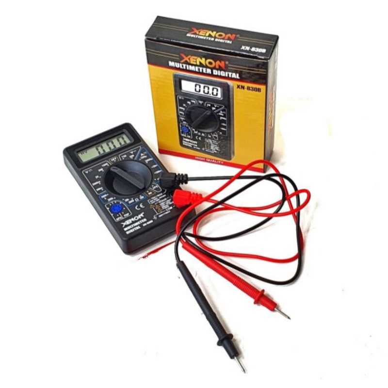 Brand : XENONSKU : XN-830BDigital Multi Meter Xenon-830Spesifikasi Produk :- Display : LCD 3-1/2 digits (1999 count) 0.5" high- Polarity : Automatic, indicated minus, assumed plus- Measure method : double integral A/D switch implement- Sampling speed : 2 times per second- Over-load indication : "1" is displayed- Operating environment : 0C to 40C, at - Storage environment : -10C to 50C, at - Power : 9V NEDA 1604 or 6F22- Static electricity : about 4mA- Product size : 126 x 70 x 26 mm- Product net weight :